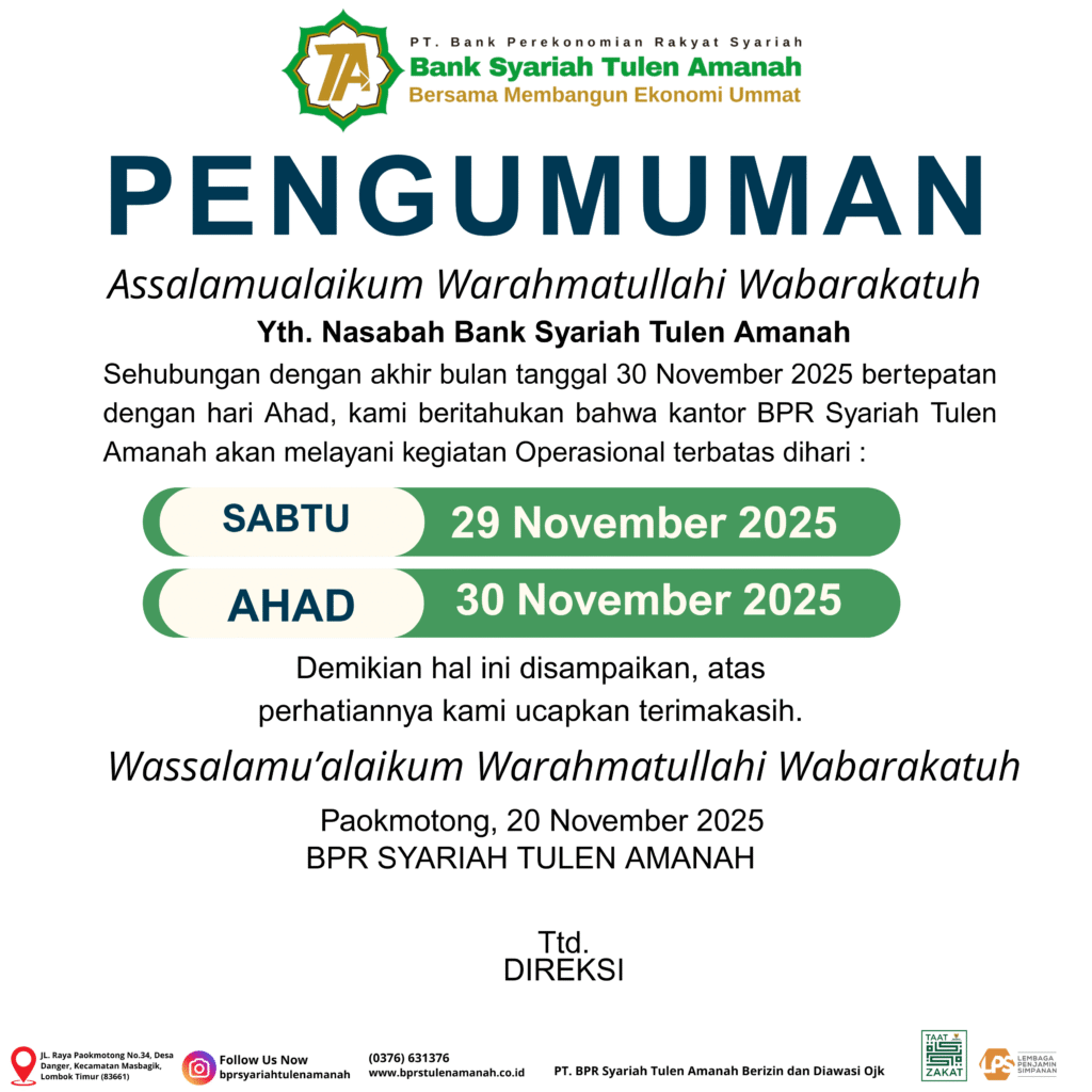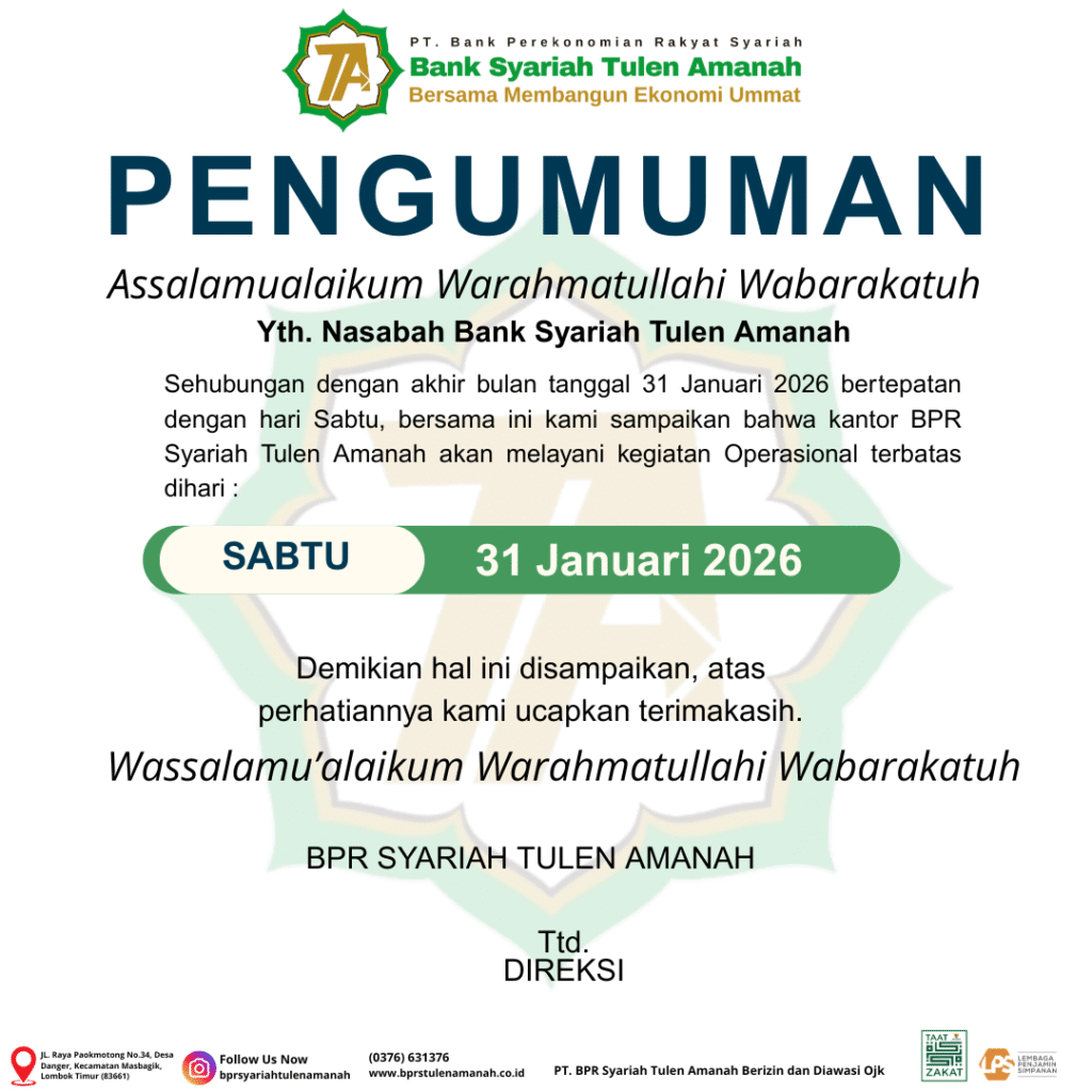 PT. BPR Syariah Tulen Amanah Berizin dan di Awasi Oleh OJK serta Merupakan Peserta Penjaminan LPS